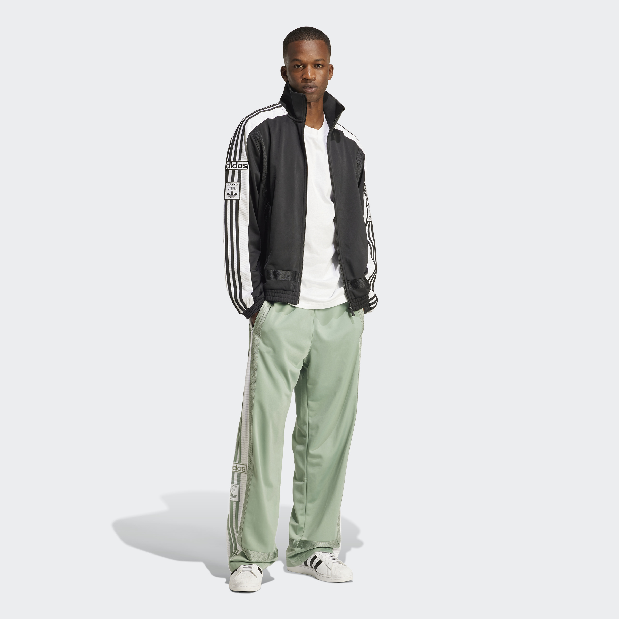 Making its debut in the '90s, the Adibreak line from adidas has been a streetwear staple ever since. Knit from sporty tricot fabric with a loose, roomy fit that's easy to layer, this track top continues the legacy with its authentic vibe and signature details. 3-Stripes down the sleeves are topped by heritage adidas logos. Make it your everyday wearer with matching track pants, jeans or fleece.