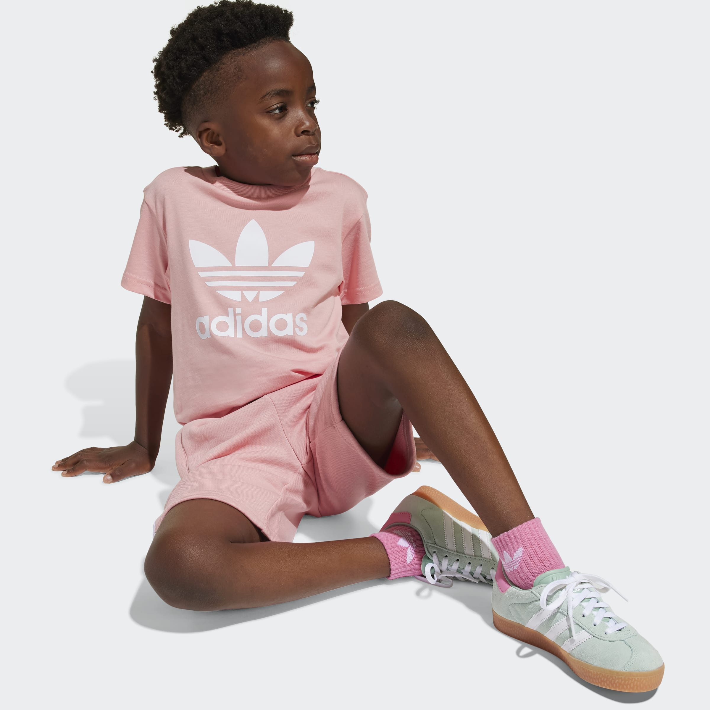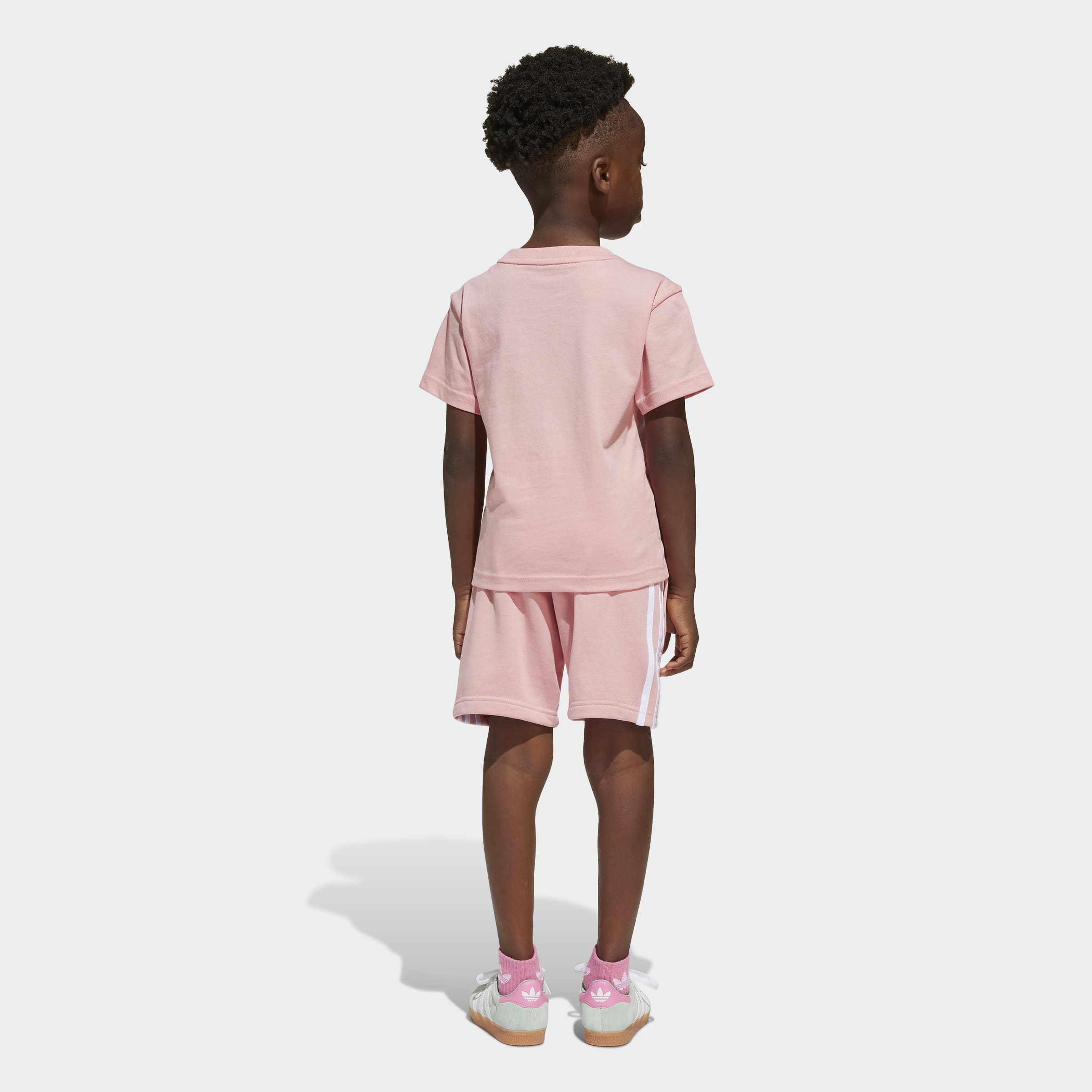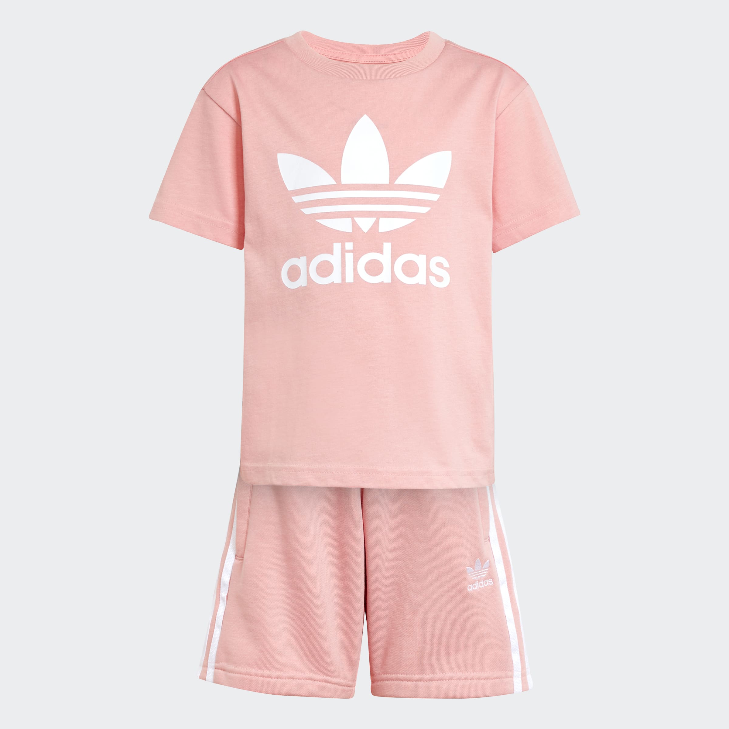 This kids' adidas shorts and tee set features a soft cotton single jersey build and a drawcord elastic waist for all-day comfort. From the oversized Trefoil on the chest to the 3-Stripes running down the legs its rooted in sport and style. Destined to become a go-to warm-weather outfit, this casual set is an everyday all-in-one outfit that's ready when they are.