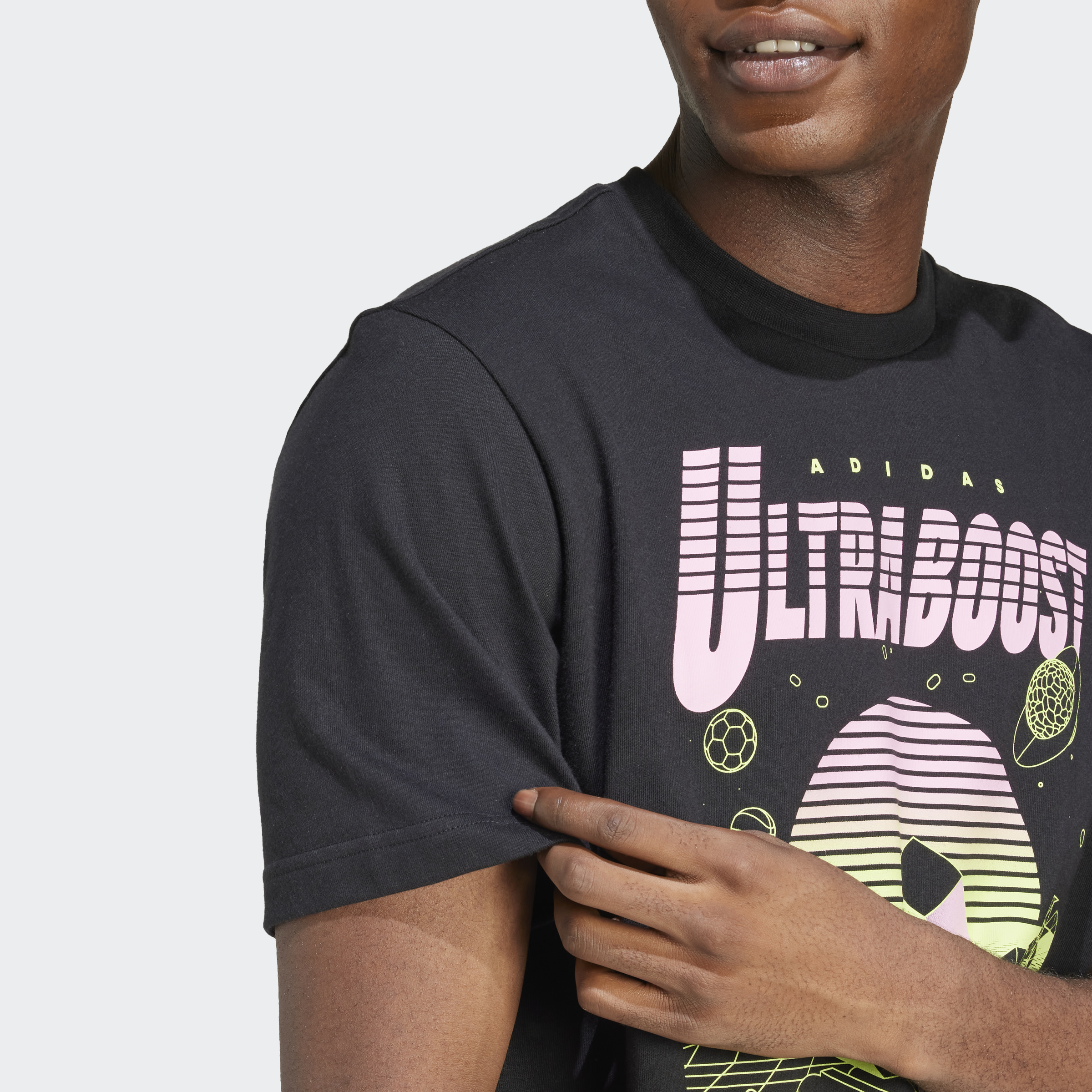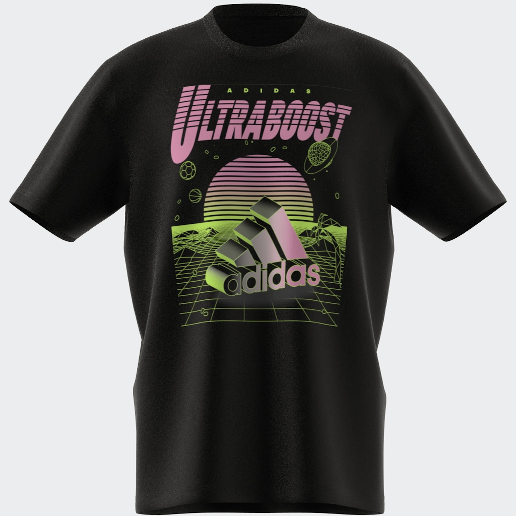 Turn up the jets and slip into casual mode in this adidas Ultraboost tee. Vivid colours pop off the all-cotton tee, in a design that nods to adi's epic, energy-returning running shoe. Screen printed flat ink ignites a vintage arcade vibe that signals your style.