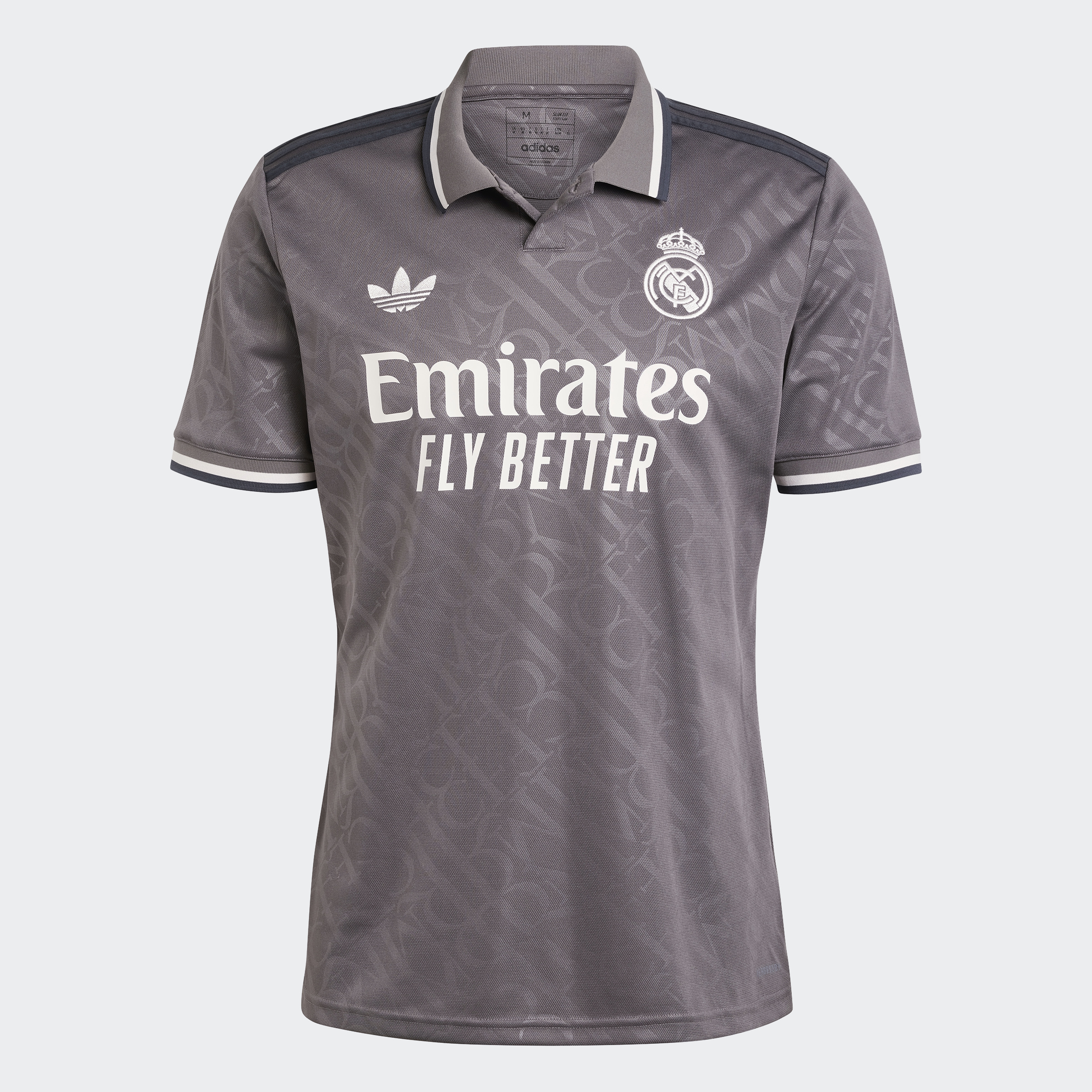 Elegance is their identity. The embossed "RMCF" monograms repeating across this Real Madrid third jersey borrow their distinctive look from the lettering used on traditional Madrid street signs. Standing out from the classy design, the iconic Trefoil returns to an adidas match shirt after a long break. Behind it all, AEROREADY keeps football fans dry and comfortable as they shout their support.This product is made with 100% recycled materials. By reusing materials that have already been created, we help to reduce waste and our reliance on finite resources and reduce the footprint of the products we make.