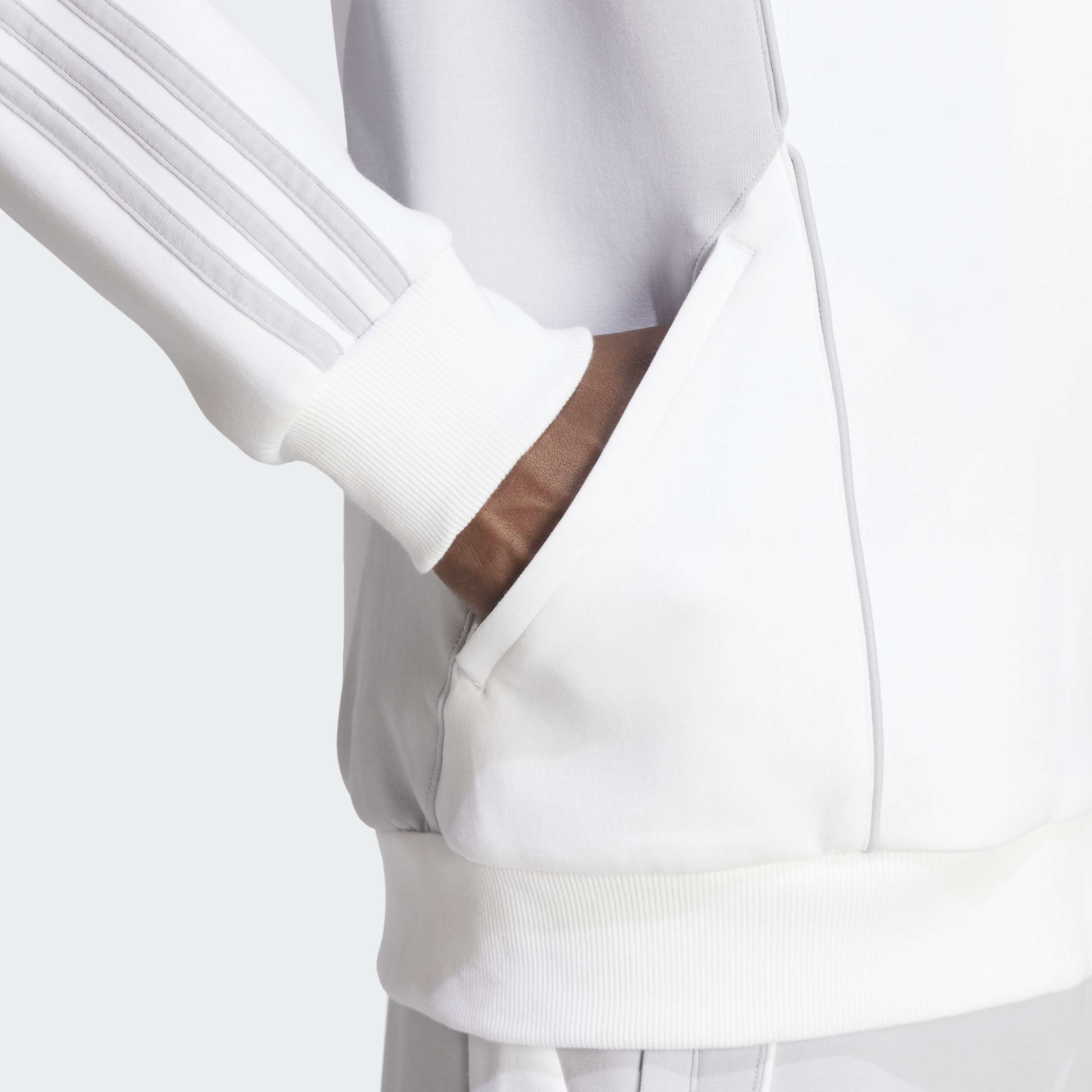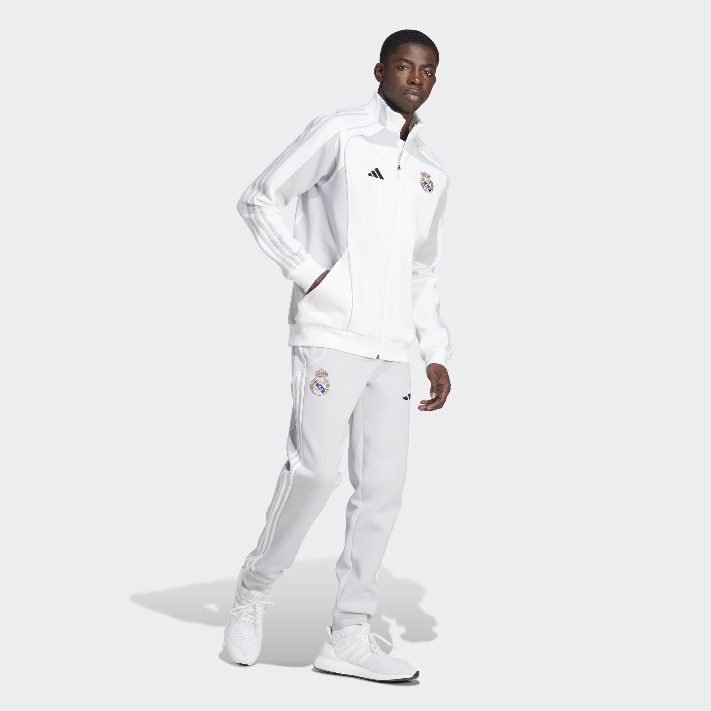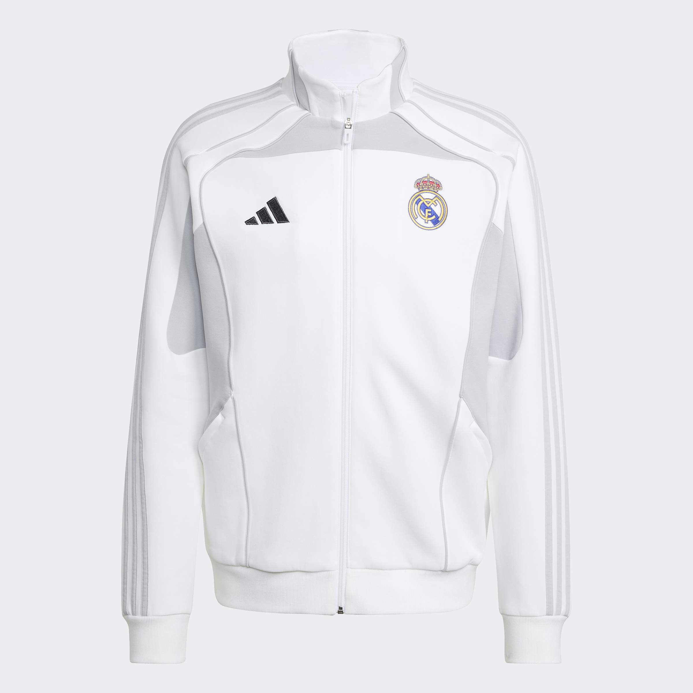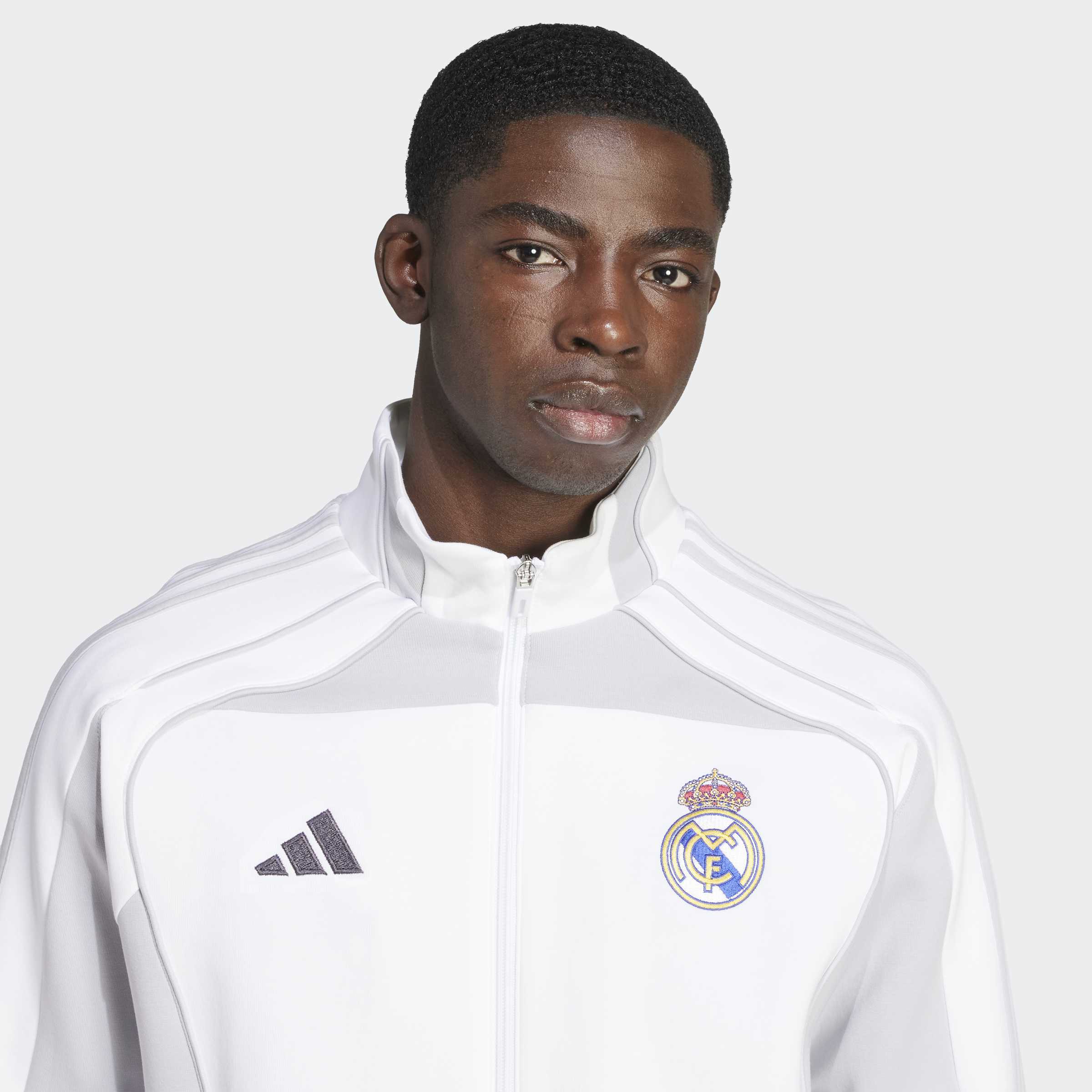 Made for loyal supporters. This adidas Real Madrid track top proudly displays your club's colours and crest. The doubleknit fabric will keep you comfortable all day long, whether you're cheering on the team or going about your day. That clean, classic design winds back the clock.