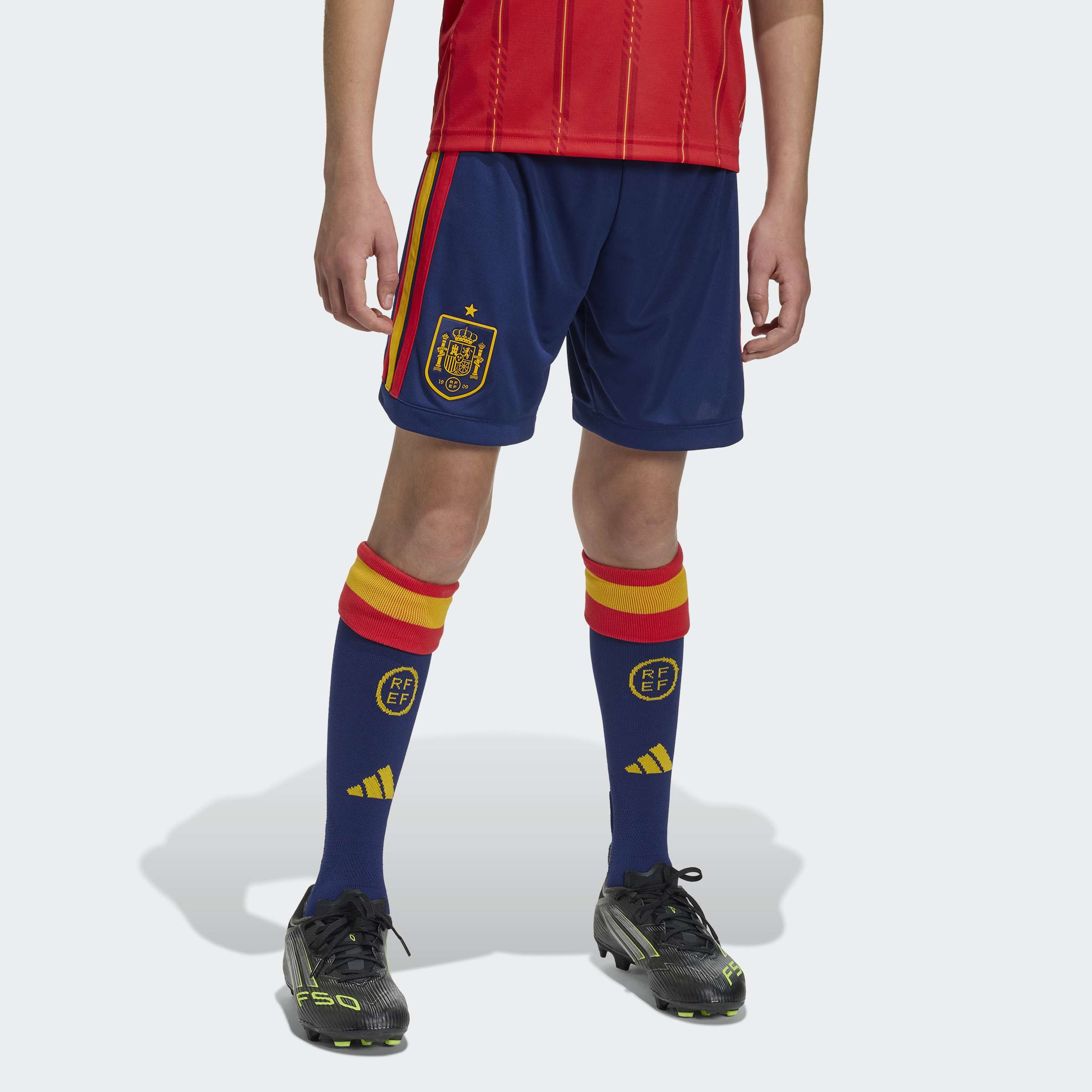 The Spain 26 Home Shorts celebrate the elegance of Spanish football, drawing inspiration from the vibrant colours of the Spanish flag. Designed for young athletes, these shorts offer a regular fit that offers comfort and freedom of movement on the pitch. Cool. Dry. Ready. Climacool wicks and disperses sweat for a cool, dry and distraction free performance. The fully elasticised waistband with a drawcord provide a secure fit, allowing for easy adjustments as they play. Interlock fabric offers durability, match after match. An embroidered adidas logo and federation crest add a touch of authenticity, making the shorts a must-have for young Spain fans. Whether they're scoring goals or cheering from the sidelines, this kit is designed to support their passion for the game.