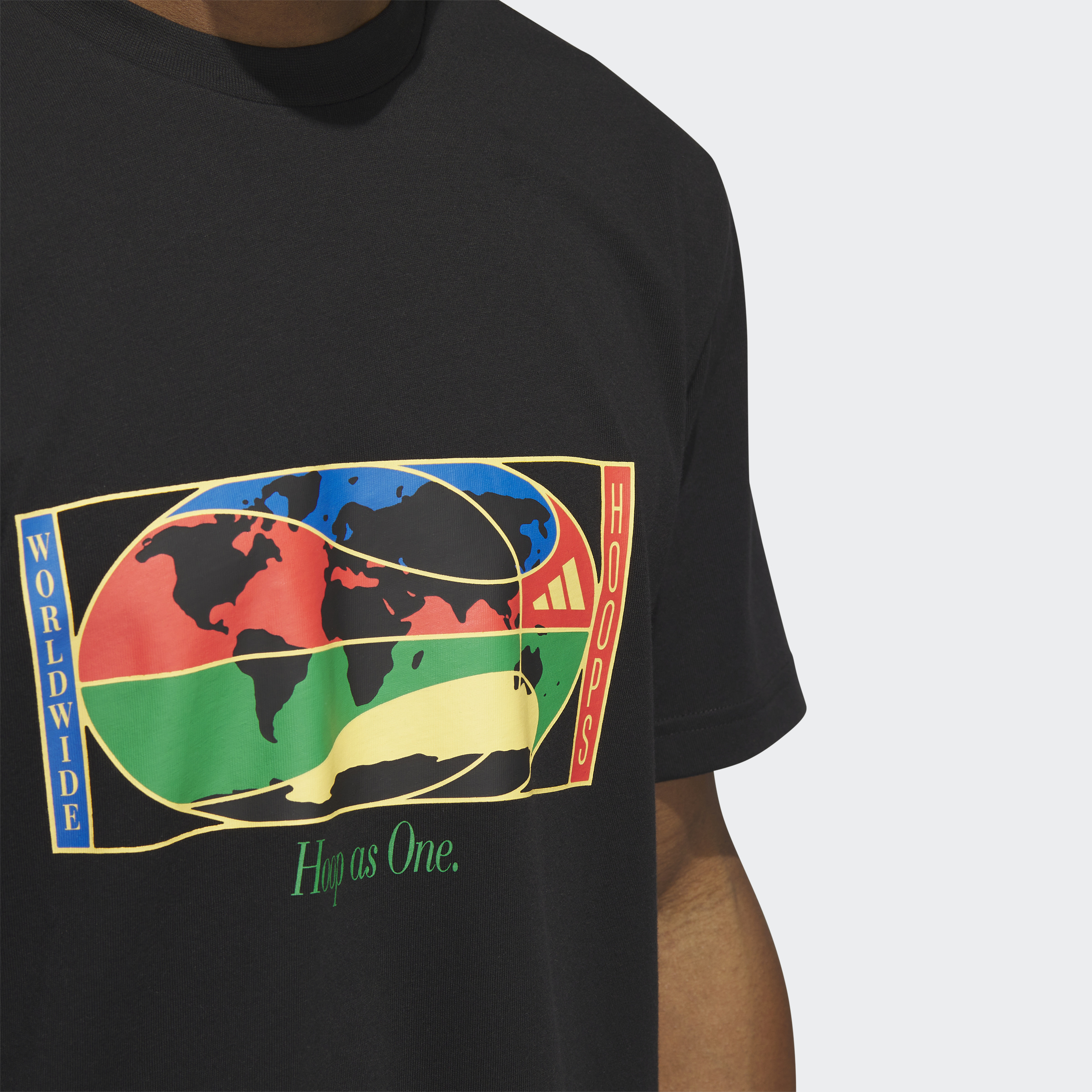 You're a citizen of the world, and basketball is your common language. This adidas tee says it all. Bold graphics inspired by 90's basketball jerseys make a global statement for inclusion on and off the court. With an easy, roomy fit and soft cotton single jersey fabric, this t-shirt is your passport to play anywhere.The cotton in this product has been sourced through Better Cotton. Better Cotton is sourced via a chain of custody model called mass balance. This means that Better Cotton is not physically traceable to end products.Find out more here: https://bettercotton.org/who-we-are/our-logo/
